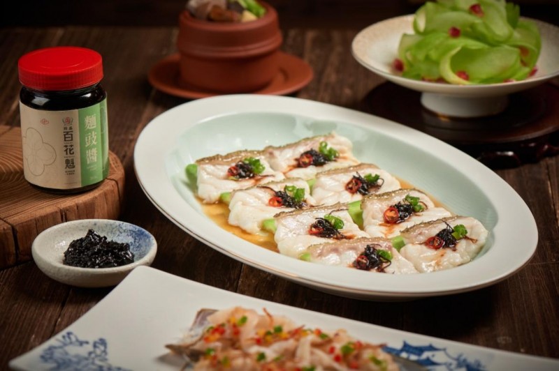 银河氹仔渔村与澳门百年老号「同益百花魁」合作,以港澳家喻户晓的酱料及凉果入馔,炮制面豉酱陈皮丝蒸深海龙趸球